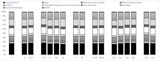 Dietary iodine sources in the subgroups of adolescents from northern Poland (T—total, macroregions: N—Northern, N-W—North-Western; location of the school: C-S—countryside, Sc—small city, Mc—medium city, Bc—big city; sex: F—female, M—male; age: 14–17 years old, 18–20 years old; Body Mass Index classification: Uw—underweight, Nw—normal weight, Ow—overweight, Ob.—obesity; iodine supplementation: I(+)—supplementing iodine, I(−)—not supplementing iodine); #—fats, chocolate, gelatin.