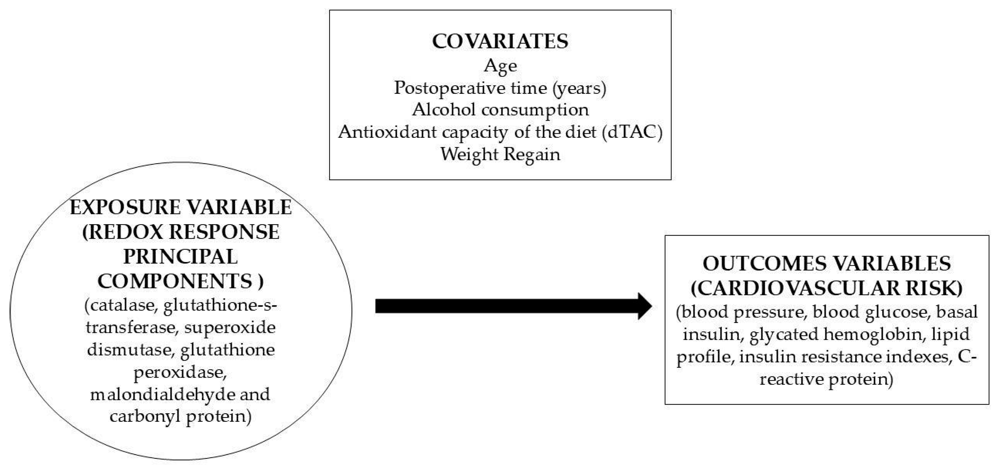 - Pinto, S.L.; Juvanhol, L.L.; de Oliveira, L.L.; Clemente, R.C.; Bressan, J. Changes in oxidative stress markers and cardiometabolic risk factors among Roux-en-Y gastric bypass patients after 3- and 12-months postsurgery follow-up. Surg. Obes. Relat. Dis. 2019, 15, 1738–1745. [Google Scholar] [CrossRef] [PubMed]