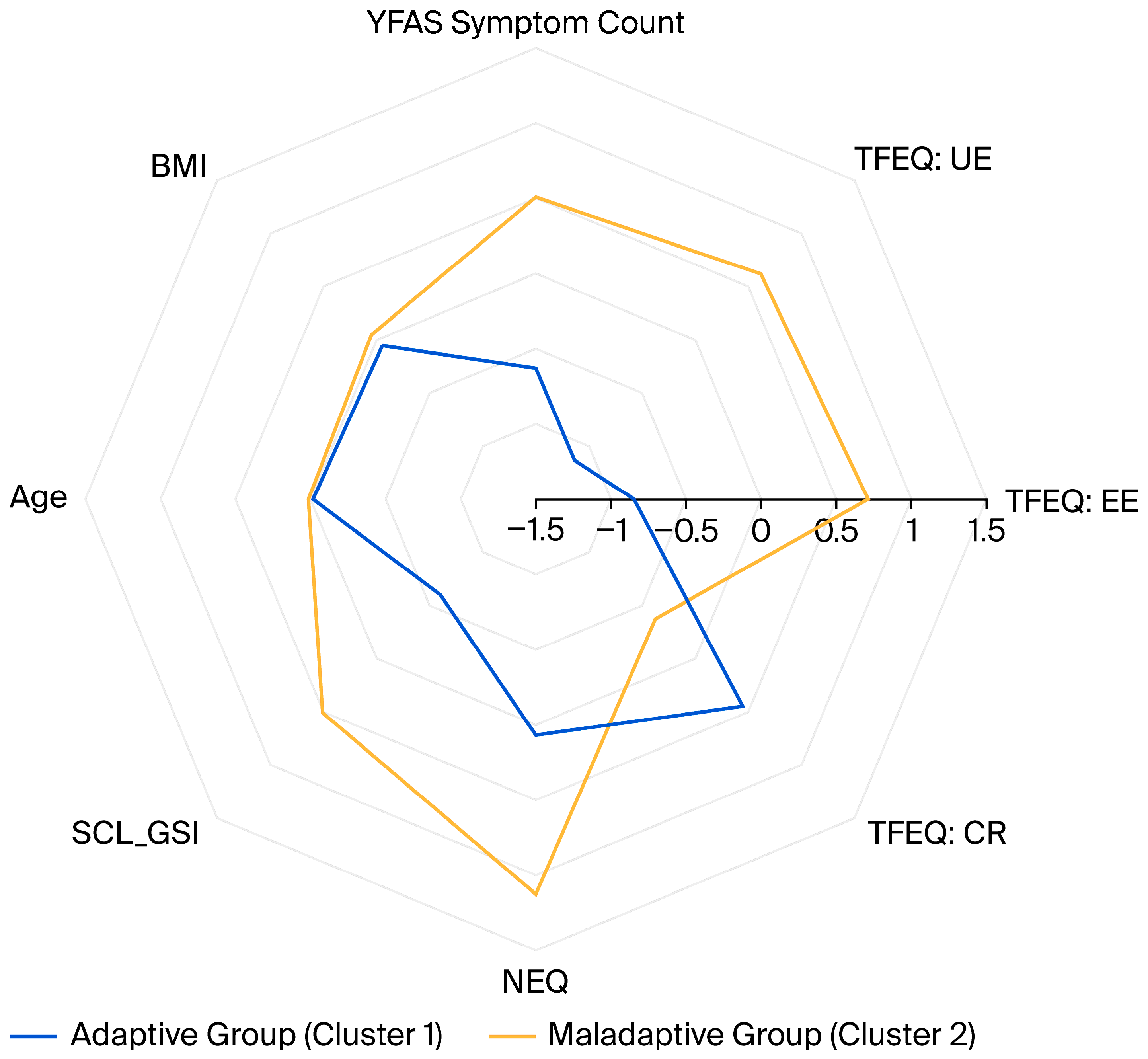 For visualization and comparison, Figure 1 presents a radar chart illustrating the two clusters across the main clustering variables, along with age and BMI. Z-standardized scores were plotted to enhance interpretability.