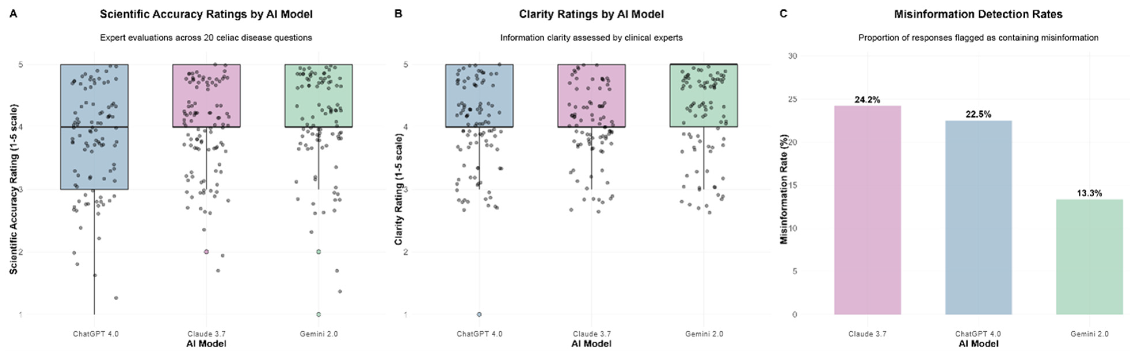 Chicago/Turabian StyleBertin, Luisa, Federica Branchi, Carolina Ciacci, Anne R. Lee, David S. Sanders, Nick Trott, and Fabiana Zingone. 2025. "Efficacy of Large Language Models in Providing Evidence-Based Patient Education for Celiac Disease: A Comparative Analysis" Nutrients 17, no. 24: 3828. https://doi.org/10.3390/nu17243828
