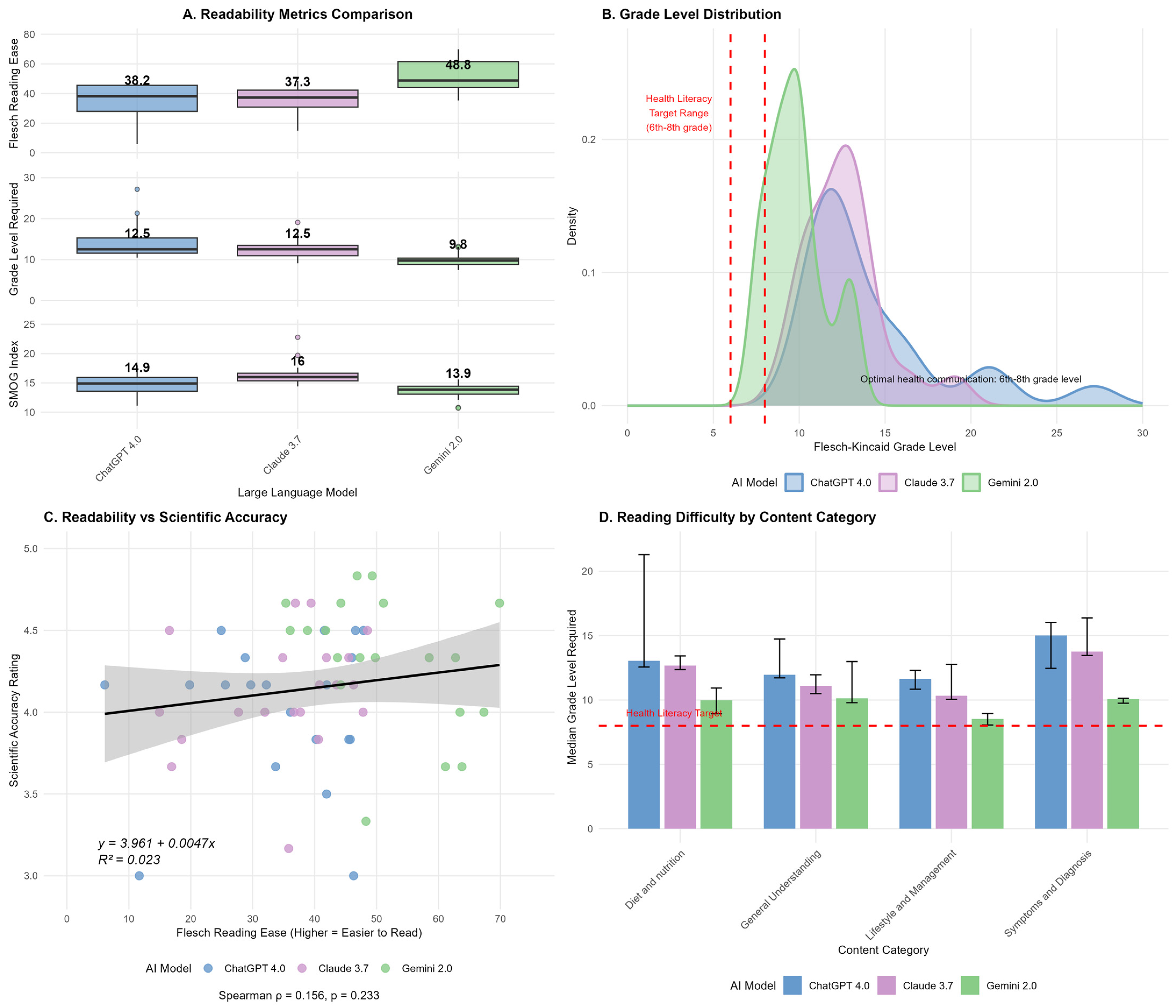 - Readability analysis: Objective linguistic assessment was performed using validated computational readability metrics: