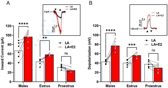 Estradiol increases Type II cell activation in a sex-dependent manner. (A) Males and females during the estrus phase of the estrous cycle display an increase in Type II taste cell inward current when FAs were combined with E2 compared to FAs alone. The same cells were used for both stimuli to examine the E2 effect (n = 7 cells for each group). Inset, example inward current trace from a male Type II taste cell that is activated by estradiol with LA + E2 or LA alone. (B) Total cellular depolarization is increased in males and females during the estrus phase of the estrous cycle when Type II taste cells are activated by LA with E2 compared to LA alone (holding potential (Vh) = −100 mV). The same cells were used for both stimuli to examine the E2 effect (n = 7 cells for each group). Inset, example traces of the total cellular depolarization from a male Type II taste cell that is activated with LA with E2 or LA alone (resting membrane potential (VMEM) = −45 mV. Cells from females in proestrus showed no enhancement of LA-induced currents or VMEM changes by E2 treatment (n = 6 cells per group). Triangles show regions of stimulus onset and termination. **** p < 0.0001; *** p < 0.001; **, p < 0.01; ns, not significant.