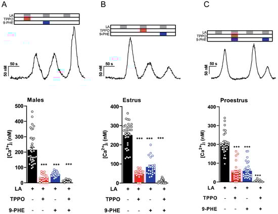 Both TRPM4 and TRPM5 antagonists inhibit intracellular calcium rise in Type II taste cells. Representative calcium traces depicting effects of TRPM4 and TRPM5 blockers on LA-induced taste cell responses from Type II taste cells in response to LA, LA with TRPM5 channel inhibitor (100 µM triphenylphosphine oxide [TPPO]), LA with TRPM4 channel inhibitor 100 µM 9-phenanthrol (9 PHE), or LA with both TRPM4 and TRPM5 channel inhibitors in males (A), females in estrus (B), and females in proestrus (C). Summary data of intracellular calcium responses induced by LA in the presence or absence of TRPM4 and TRPM5 channel inhibitors are shown from the same group below. TRPM4 and TRPM5 channel inhibitors decreased LA-induced intracellular calcium concentration in Type II taste cells (error bars indicate SEM across cells; n = 23–34 cells from males, n = 23 cells from females on estrus, and n = 25–31 cells from females on proestrus). *** p < 0.001.