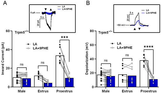 To test the ability of early-phase females to utilize a TRPM5-independent pathway, we used Trpm5 knockout mice and the TRPM4 antagonist 9-PHE. Two-way ANOVA with Bonferroni’s method for post hoc multiple comparisons was performed. We found that the remaining inward current in the Trpm5−/− males and females in the estrus phase showed no significant difference from the loss of Trpm5 in the presence or absence of TRPM4 inhibitors (p > 0.999, estrus: p = 0.133). However, the LA-induced inward current from females in the proestrus phase significantly decreased when TRPM4 function was inhibited in addition to the loss of Trpm5, as shown in Figure 5A (proestrus: p < 0.0001). Similar to the effects in LA-induced inward currents, the LA-induced total cellular depolarization was only affected by TRPM4 inhibition in the females during the proestrus phase, as shown in Figure 5B (males: p > 0.999, estrus: p > 0.999, proestrus: p < 0.0001). These results indicate that LA activation in taste cells shows sex- and estrus-cycle-dependent differences in TRPM4′s role, and support a functional role for TRPM4 in Trpm5−/− mice.