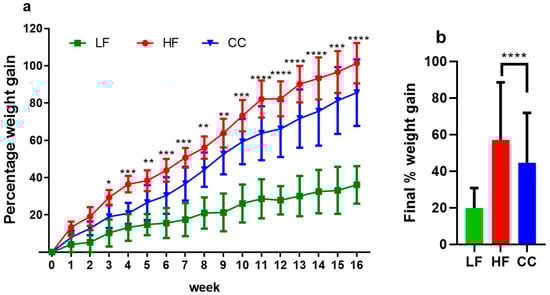 (a) Average percentage body weight changes over 16-week period. (b) Final percentage weight gained at week 16 compared to initial weight. Values depicted are means ± SD, n = 12, and * p < 0.05, ** p < 0.01, *** p < 0.001, and **** p < 0.0001 indicate significant differences between the HF and CC groups for every week’s value.