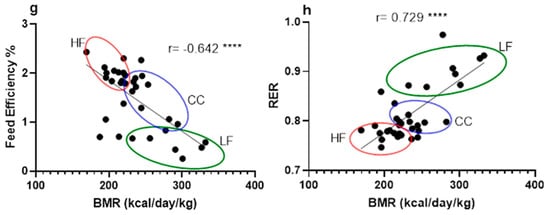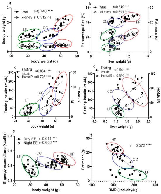 Correlation between phenotypic data across LF, HF, and CC groups analyzed together using linear regression for calculation of Pearson coefficient (n = 35). (a) Correlation between tissue mass (liver and kidney) vs. mouse body weight measurement. (b) Correlation between fat percentage and mouse liver weight. (c) Correlation comparison of fasting insulin vs. body weight and HOMA-IR vs. body weight. (d) Correlation between fasting insulin level and liver weight. (e) Correlation between hourly daytime energy expenditure and hourly nighttime energy expenditure against mouse body weight. (f) Correlation between BMR and mouse individual fat mass. (g) Correlation between BMR and feed efficiency of individual mice. (h) Correlation between BMR and RER from individual mice. Data points are grouped and noted with individual r values shown on each figure along with significance notation: *** p < 0.001, and **** p < 0.0001.