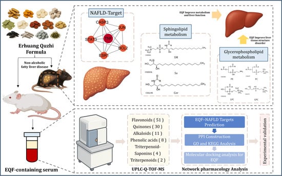 - Pan, P.; Chen, W.; Wu, X.; Li, C.; Gao, Y.; Qin, D. Active Targets and Potential Mechanisms of Erhuang Quzhi Formula in Treating NAFLD: Network Analysis and Experimental Assessment. Cell Biochem. Biophys. 2024, 82, 3297–3315. [Google Scholar] [CrossRef]