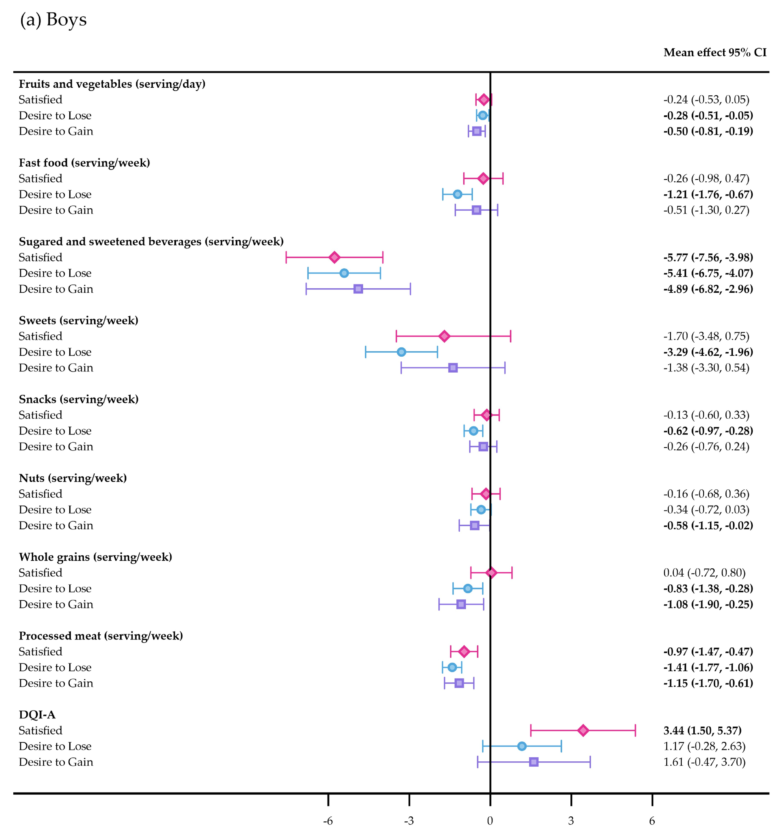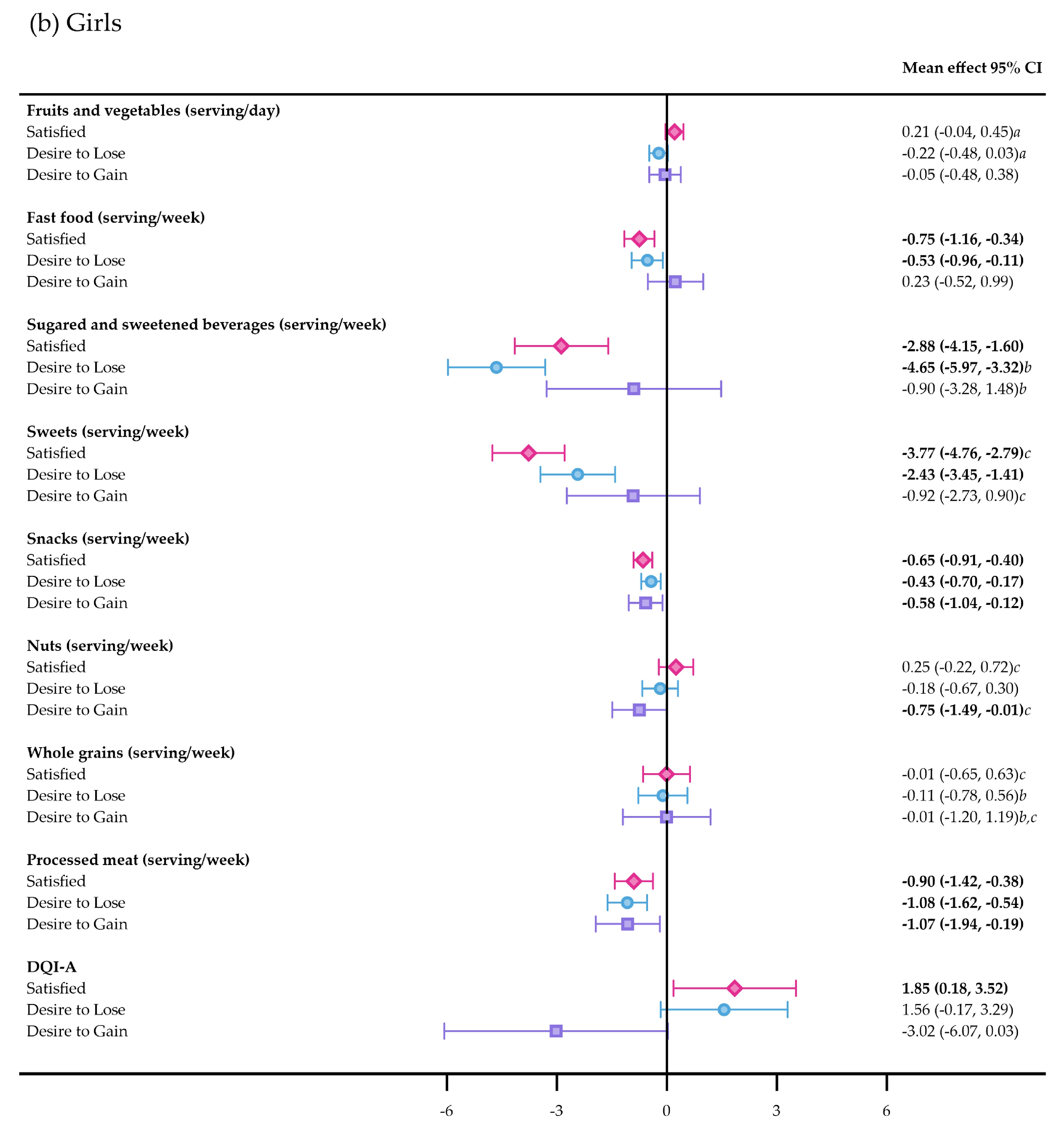 | Sweets (serving/week) | 10.1 (9.0; 11.3) | 8.8 (7.7; 9.9) b | 11.8 (10.5; 13.1) b | 10.4 (8.6; 12.1) | 9.7 (8.0; 11.4) | 10.9 (8.7; 13.1) |