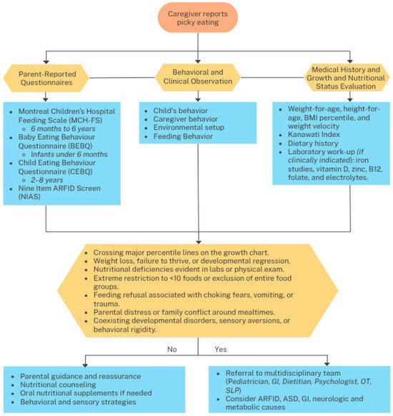 Clinical algorithm for the evaluation and management of picky eating in Children. Abbreviations: ARFID: Avoidant/Restrictive Food Intake Disorder; ASD: Autism Spectrum Disorder; GI: Gastrointestinal; OT: Occupational Therapist; SLP: Speech and Language Pathologist.