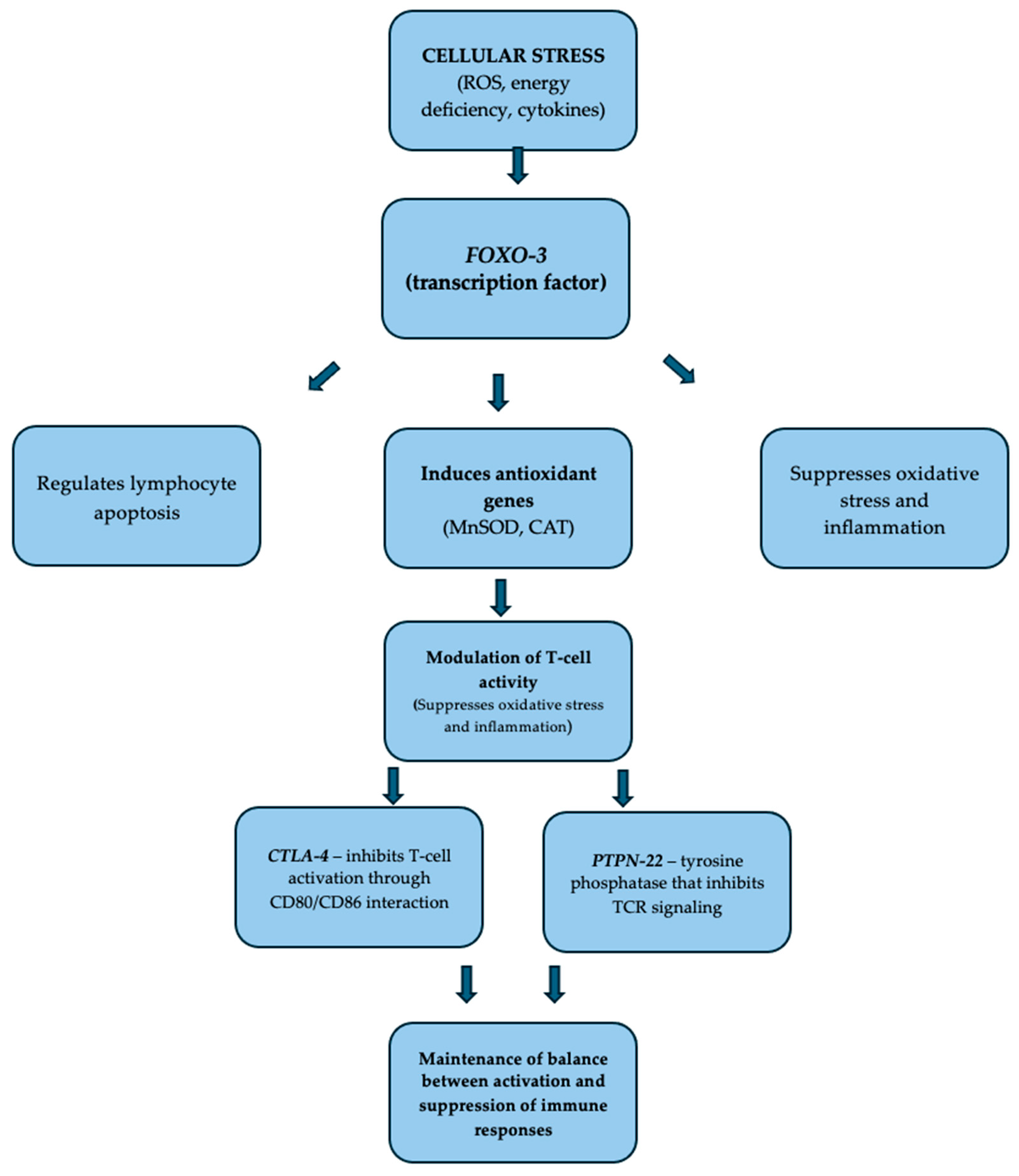 The emerging literature supports the role of FOXO-3 variants in metabolic regulation and liver fat accumulation; for example, in a Southern Italian cohort the FOXO-3 rs2802292 G allele was found to influence food intake and MASLD risk [30,31]. Taken together, our results point to a dual involvement of immune regulation and metabolic pathways via CTLA-4, PTPN-22, and FOXO-3 variants in this T1D sample.