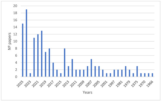 Evolution of the number of indexed international publications on bacterioruberin (according to PubMed; Keyword: bacterioruberin; https://pubmed.ncbi.nlm.nih.gov/?term=bacterioruberin&sort=date, accessed on 28 October 2025).