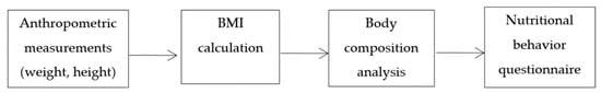 The study was divided into 4 steps (Figure 2). During the study session, height and weight measurements were taken, from which BMI was calculated. Each child then received a QEB questionnaire with the appropriate BMI code, allowing for anonymized analysis of the results—without revealing participants’ personal information. The data was analyzed only at the group level, any individual linkage was not possible, The questionnaires were completed individually in the assistance of the research team member, who provided clarifications as needed. After completing the questionnaire, a bioimpedance body composition analysis (BIA) was performed. The sequence of measurements during each session is illustrated in Figure 2.