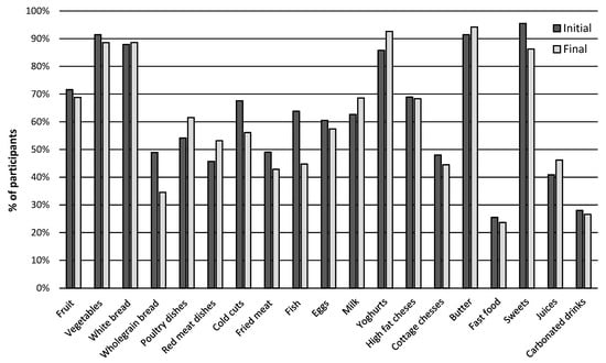 SPA children consumed milk more frequently than EPA children (40.18% vs. 27.90%; p = 0.005). Cottage cheese and yogurt consumption was higher in EPA and consumption of fatty cheeses was similar in both groups (EPA 19.50%; SPA 15.20%; p = 0.801). Daily butter consumption was very frequent in both groups (SPA 64.25%; EPA 57.90%; p = 0.734) (see Supplementary Table S2).