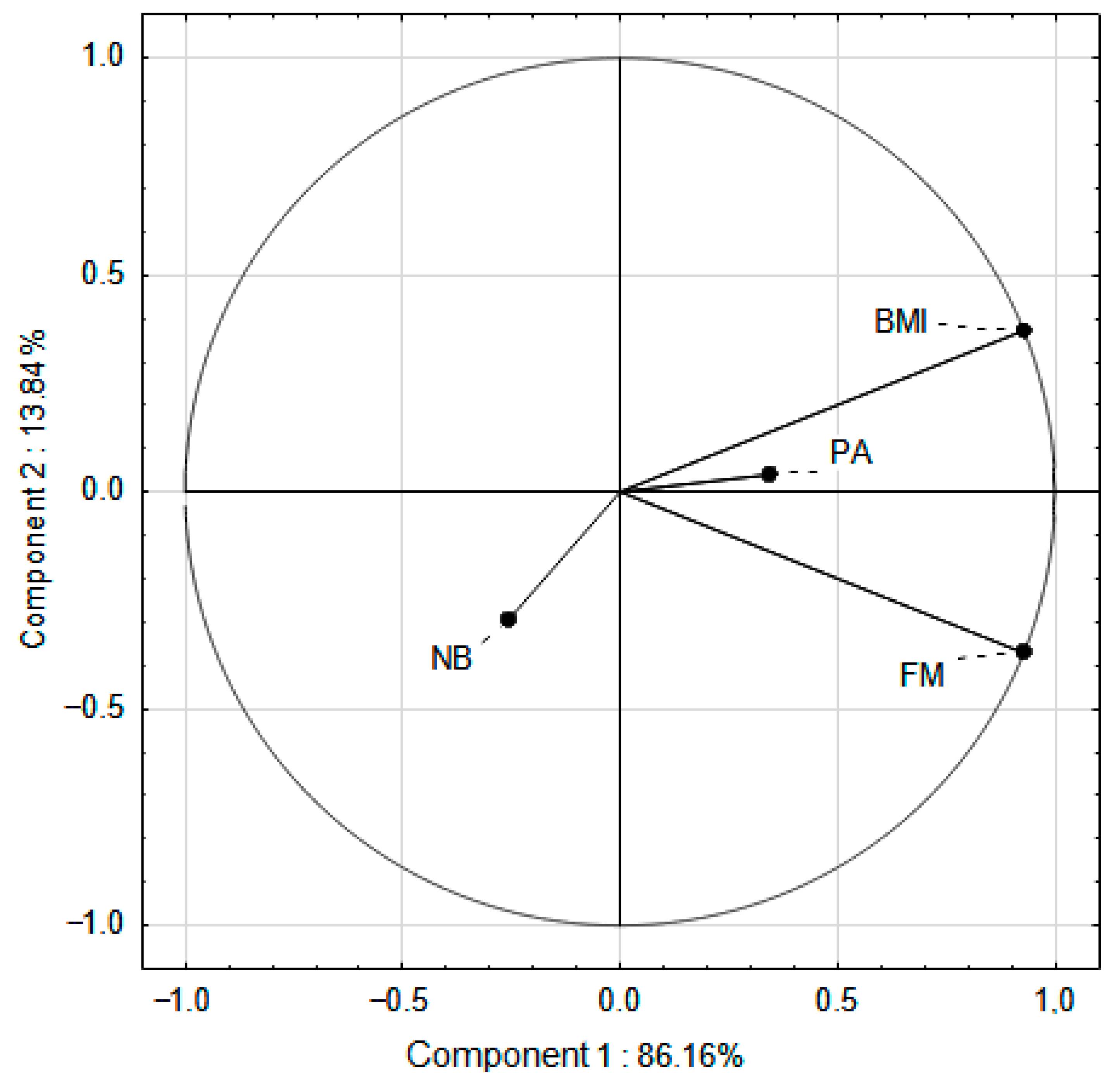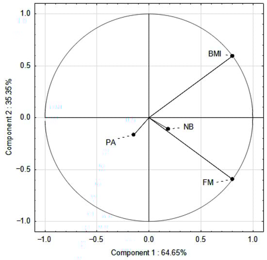 The aim of PCA was to find common factors, the so-called principal components, among BMI, FM, nutritional behavior, and PA level. The coefficients were in the range of 1; −1. The above methods allowed to determine the main factors influencing the results.