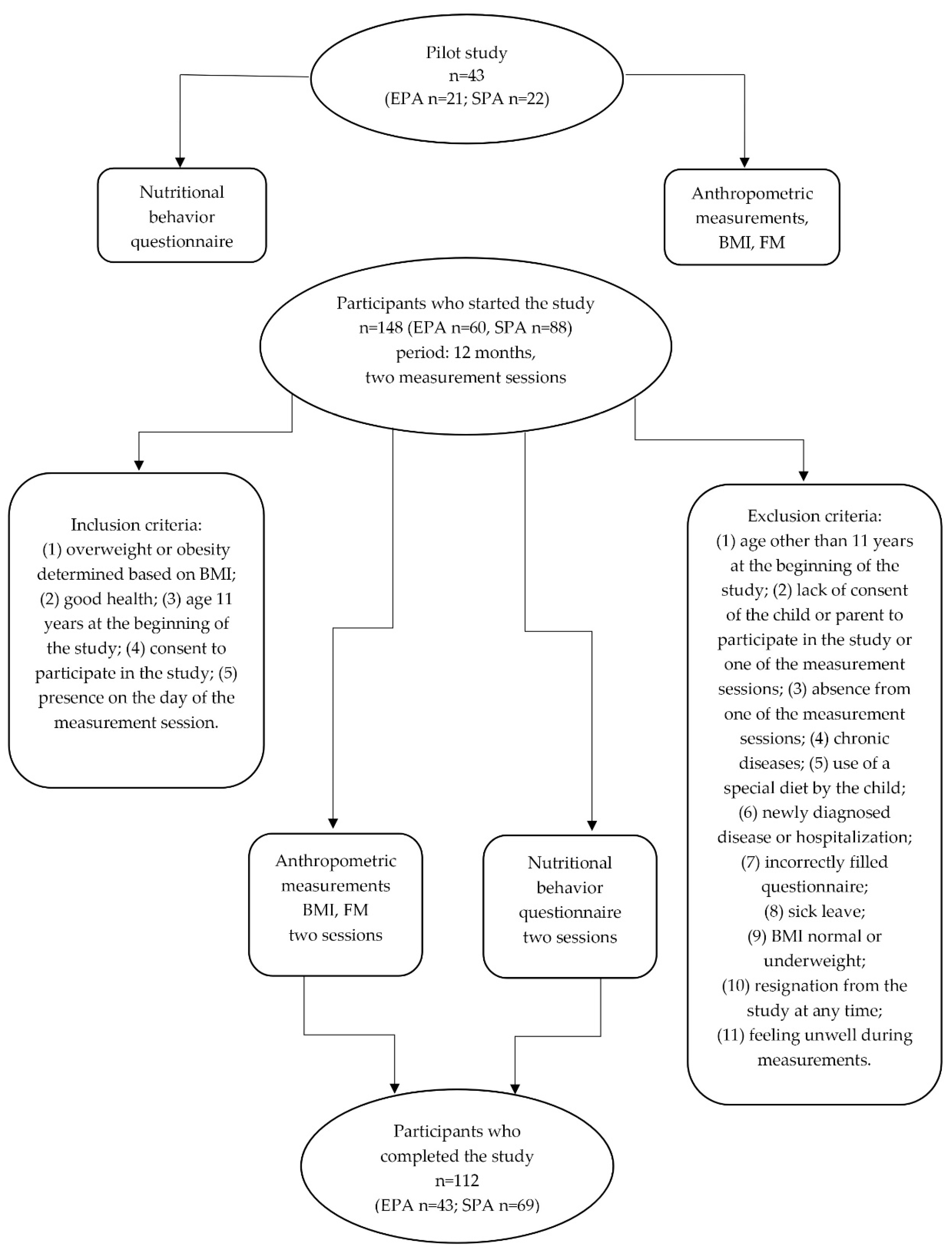 Flow chart of the study design and participants’ recruitment. EPA—elevated PA group; SPA—standard PA group; BMI—body mass index; FM—fat mass.