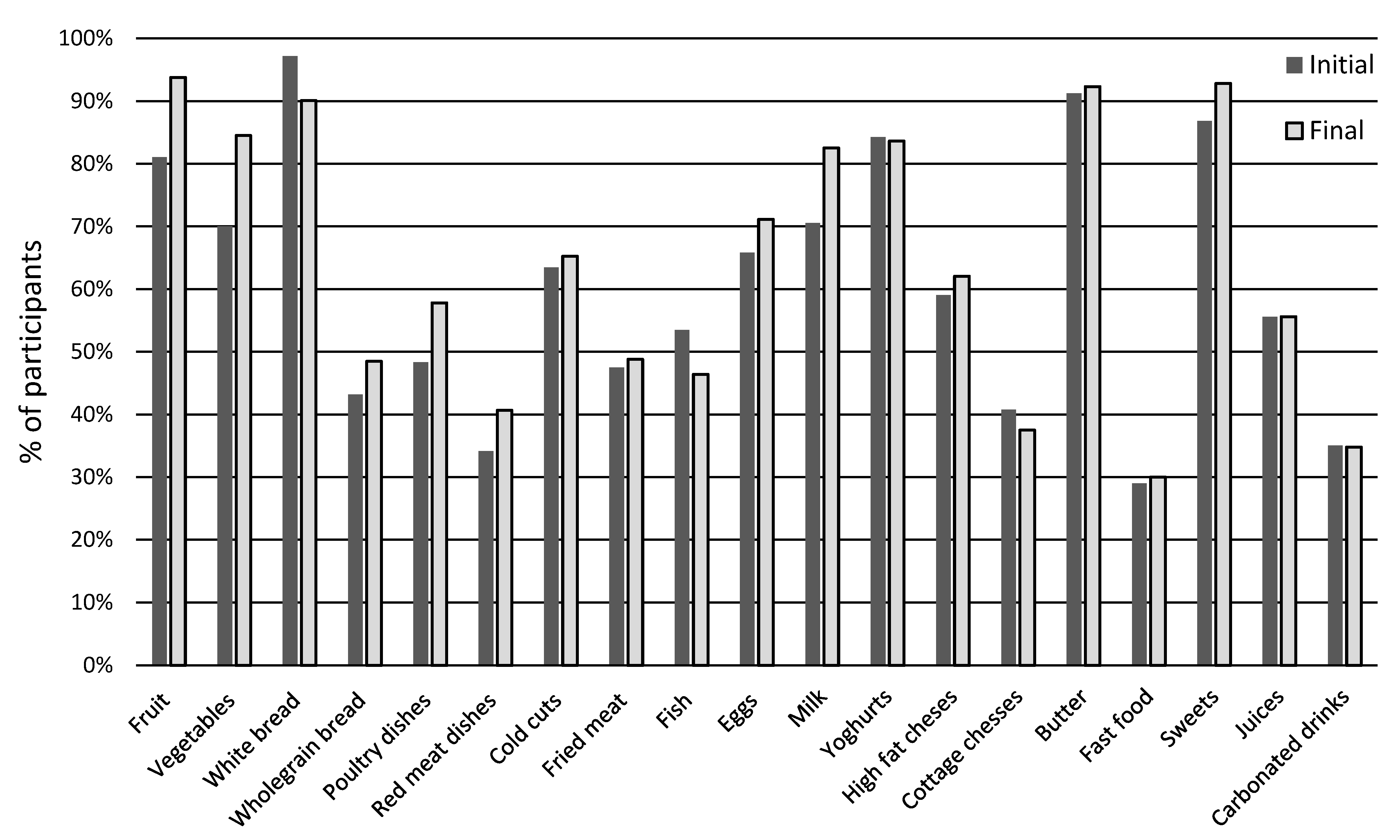 Sweets were consumed daily by approximately half of the children, with no significant between-group difference. Fast-food intake was also similar.