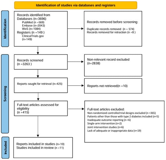 Among the 415 full-text articles assessed for eligibility, 404 were excluded for the following reasons: 365 non-randomized designs, 5 studies enrolling non-T2DM populations, 2 duplicate publications from the same trial, 6 with inadequate outcome data, 2 single-arm interventions, 6 multi-component interventions where a Mediterranean diet was not the primary component, and 19 with missing or inappropriate data. Finally, only 10 publications reporting on 11 RCTs met all inclusion criteria (Figure 1).
