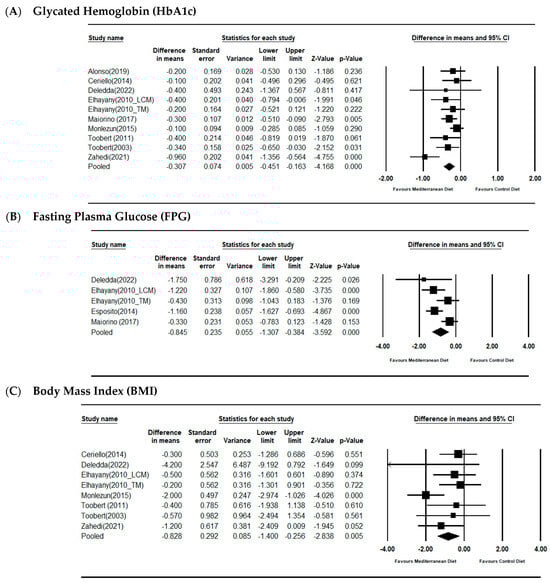 Anthropometric outcomes showed modest but statistically significant BMI reduction favoring Mediterranean diet interventions (MD −0.828 kg/m2; 95% CI: −1.4 to −0.256; p = 0.005) using random-effects models, with low heterogeneity (I2 = 34.81%) (Figure 2C).