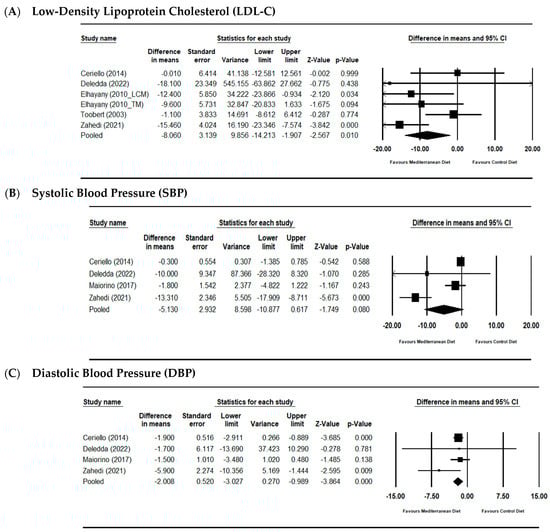 Mediterranean dietary patterns showed favorable LDL-C effects compared with control diets (MD −8.060 mg/dL; 95% CI: −14.213 to −1.907; p = 0.01) using random-effects models, with low-to-moderate heterogeneity (I2 = 44.8%) (Figure 3A).
