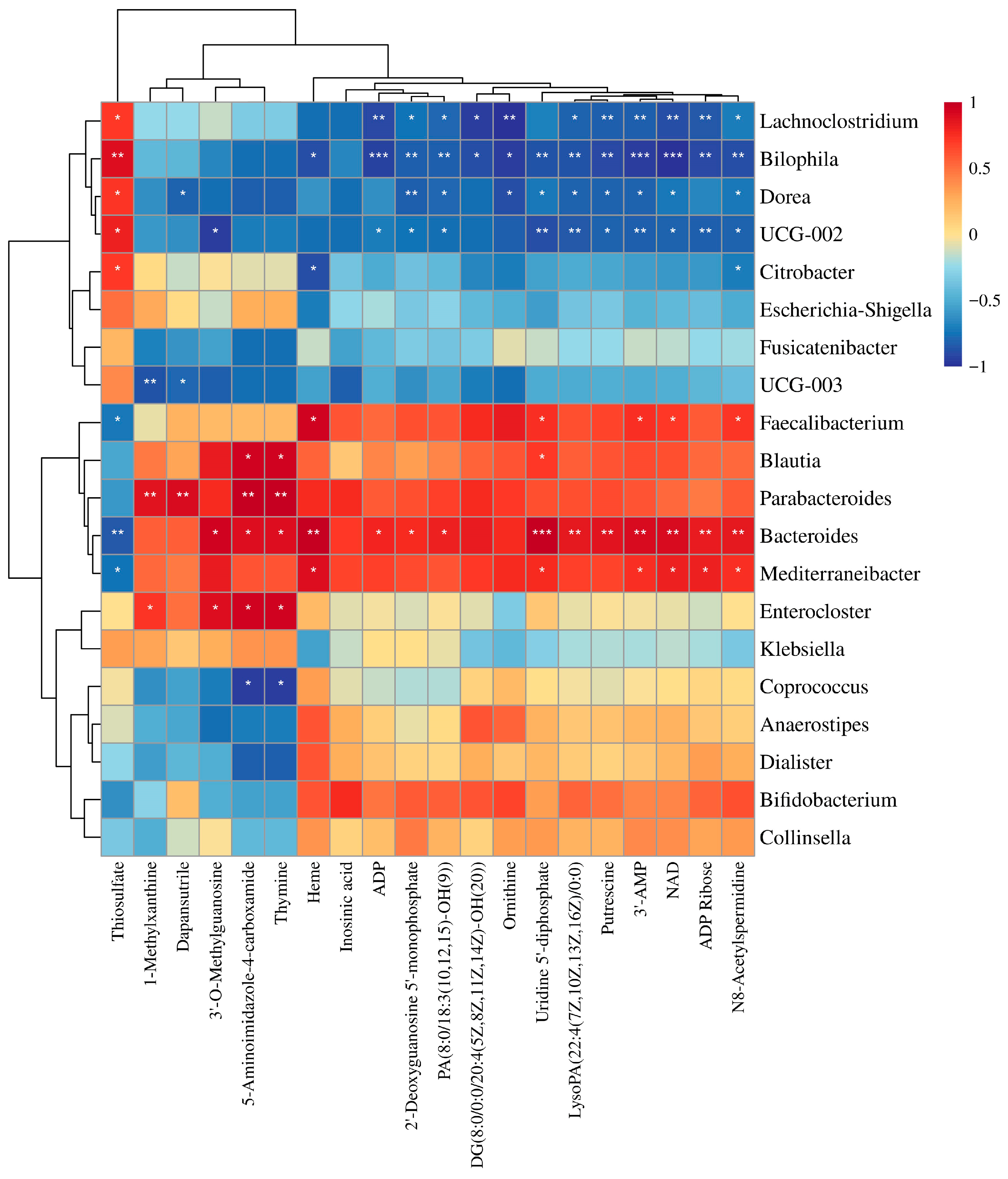 3.7. Correlation Analysis of Gut Microbiota and Metabolites