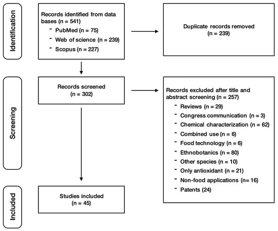 This systematic review was performed following the general principles published in the Preferred Reporting Items for Systematic Reviews and Meta-Analyses (PRISMA) 2020 guidelines [9,10]. The search was carried out in April 2025 in three commonly used databases: PubMed, Web of Science, and Scopus. The search strategy was constructed by combining all relevant terms related to O. dillenii in the following query: (“Opuntia dillenii” or “O. dillenii” or “Opuntia stricta var. dillenii”). No date, type of publication, or language filters were applied in order to initially include all articles related to the object of study.