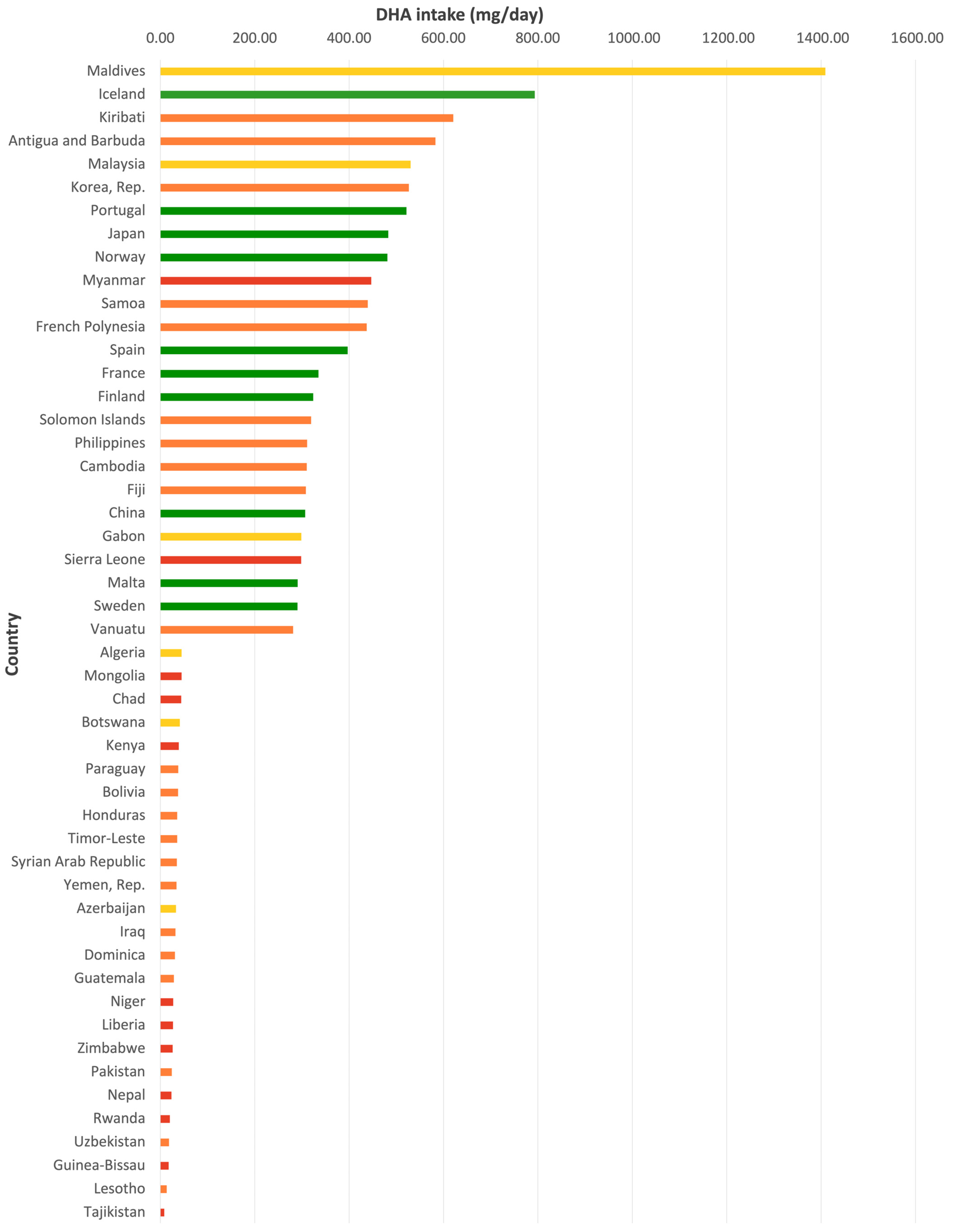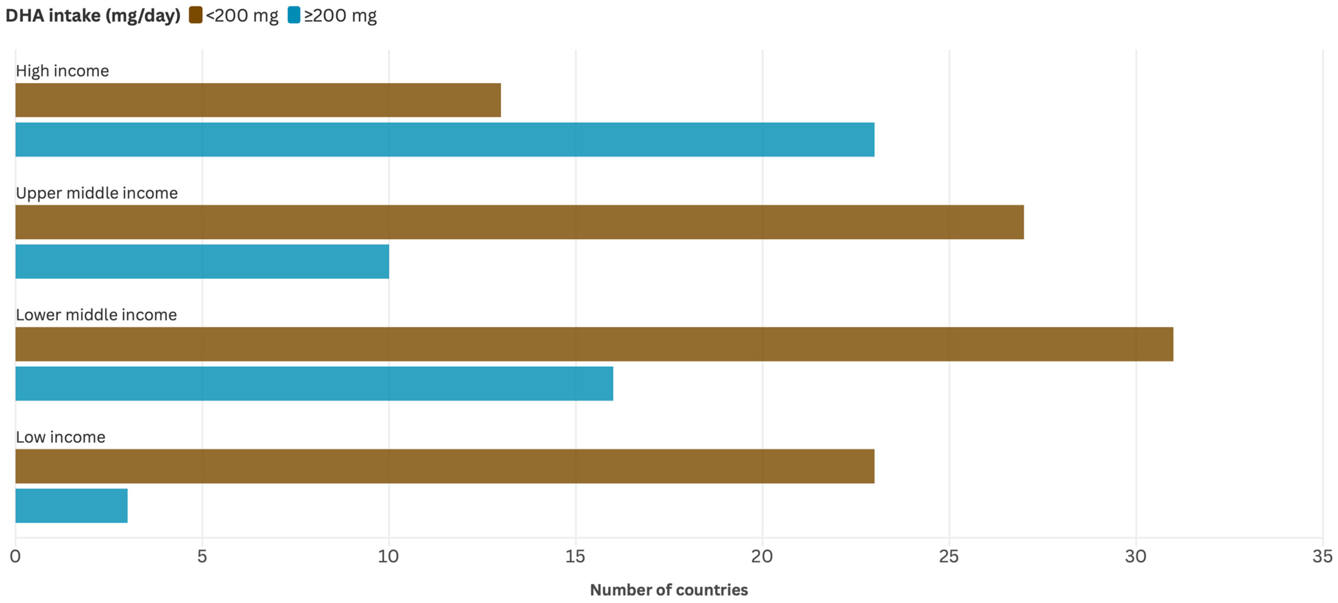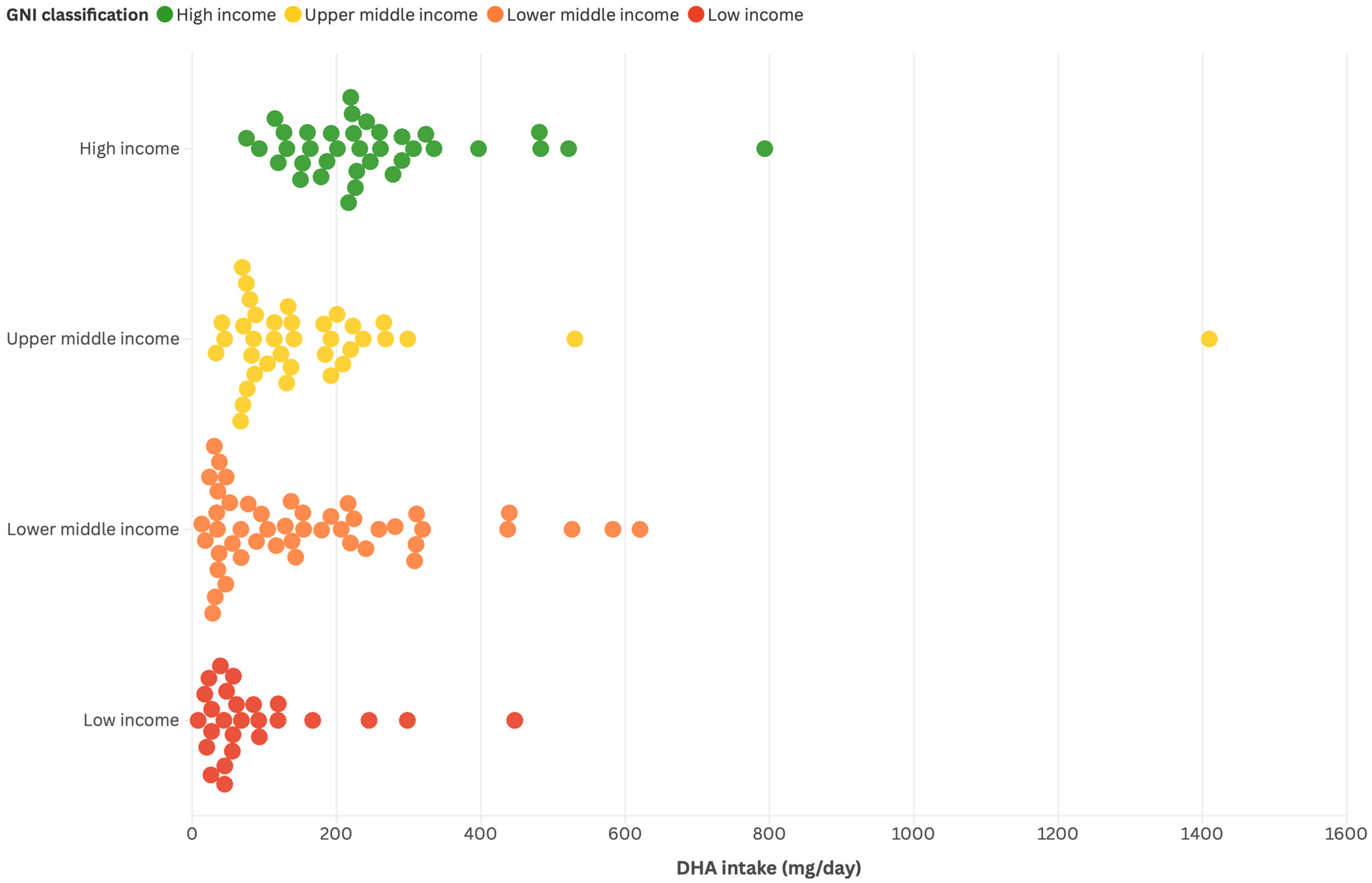 | Forsyth, 2016 [86] Multi-country (175 nations, global analysis). | 175 countries, grouped by World Bank classification: high, upper-middle, lower-middle, and low income. | Intake (national per capita DHA availability) | Ecological study using FAO FBS (2009–2011), fatty-acid composition from NUTTAB 2010, adjusted for retail/household wastage | Not applicable (national-level ecological estimates) | Estimated per capita DHA availability from FAO FBS combined with food fatty-acid composition tables (NUTTAB 2010) | Dietary availability only (no individual dietary surveys; no biomarkers) | Global DHA intake (by GNI): High-income: 192 mg/day (range: 67–706; n = 42) Upper-middle-income: 122 mg/day (range: 31–371; n = 49) Lower-middle-income: 134 mg/day (range: 13–605; n = 53) Low-income: 47 mg/day (range: 6–437; n = 28) Extremes: Highest intake: Maldives (1409.3 mg/day) Lowest intake: Ethiopia (7.01 mg/day) Sub-Saharan Africa: several countries with intakes < 50 mg/day; Ethiopia lowest (7.0 mg/day). Southern, Western, and Central Asia: many countries within 20–60 mg/day, reflecting very limited DHA intake. Small island states: highest median intake, 204.7 mg/day, consistent with reliance on marine foods. Latin America: median 134.2 mg/day (range: 28–561). Peru: 208.9 mg/day (highest); Guatemala: 28.4 mg/day; Paraguay: 37.7 mg/day (lowest) Sources and modifiers: Fish and seafood: main contributors to DHA supply worldwide. Landlocked countries: substantially lower intake (median 47.4 mg/day). Correlations: National birth rates negatively associated with DHA intake (r = −0.277; p < 0.001). * No individual adjustment; ecological estimates based on FAO FBS, corrected for wastage; stratified by GNI, geography (coastal vs. landlocked), and birth rates. |