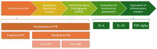 Stages of the observational study. Abbreviations: pSWE—point Shear Wave Elastography; MASLD—Metabolic Dysfunction-Associated Steatotic Liver Disease; IL-6—Interleukin 6; IL-10—Interleukin 10; TNF alpha—Tumor Necrosis Factor alpha.