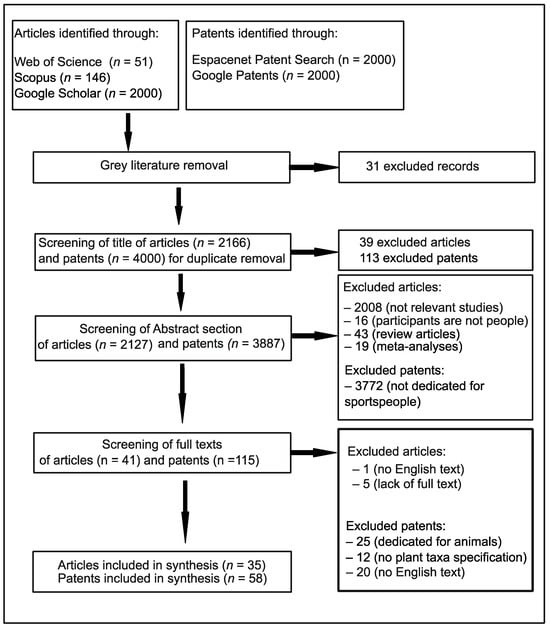 Scientific articles were searched for by browsing the ISI Web of Science (all databases), Scopus, and Google Scholar (the most widely used database for bibliometric analyses), while patents were searched for by browsing the Google Patents and Espacenet Patent search engines, gathering the largest number of open-access patents [45,46]. The survey of literature records published from 1 January 2015 up to 31 December 2024 was carried out with factorial combinations of the following keywords in the searches: (‘oil’) and (’plant’ or ‘vegetable’) and (‘sport’ or ‘athlete’). The selection terms were examined from the title and abstract. The literature search was conducted from 1 to 31 August 2025. Due to the number of records ranging from a dozen to tens of thousands, after searching for particular combinations of keywords, the analysis was limited to the first 500 records in the case of Google Scholar, Google Patents, and Espacenet. Such a number was judged to be appropriate after a pilot study showing that, with increasing record numbers over 500, the number of duplicates increased substantially. As such, the search included 2000 hits from Google Scholar, 2000 from Google Patents, and 2000 from Espacenet. Following the removal of duplicates (publications indexed in more than one database), the abstracts and descriptions of patents were screened for relevance and eligibility.