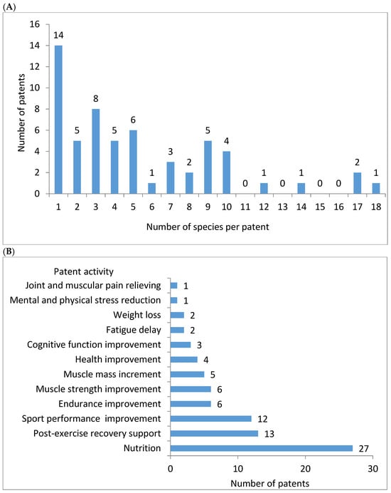 From 1 to 18 species per patent were found in the surveyed description of patented inventions (Figure 2A). The greatest number of patents was based on one plant species as the source of oil. From 2 to 10 species were mentioned in a lower number of inventions, while more than 10 species were mentioned only in one or two inventions. The performed survey evidenced that the patented products focused on a wide area of activities (Figure 2B). The majority of disclosures referred to the nutrition of sportspeople. A considerable number of patents concentrated on post-exercise recovery support, as well as sport performance improvement. Other areas of activity were linked to improvement of athletic endurance, as well as muscle mass and strength. Relatively few authors pointed out the role of the inventions in the improvement of health or cognitive function, delay of fatigue, weight loss, mental and physical stress reduction, or relief of joint and muscular pain.