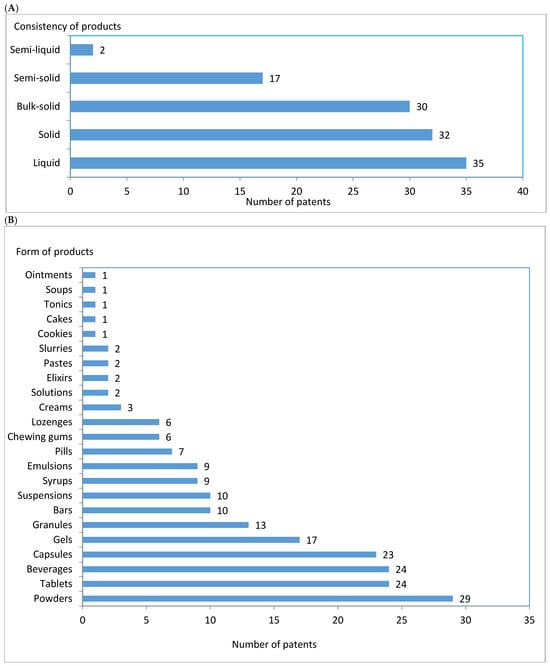According to the patent description, the invented products might be provided in a variety of consistencies: from liquid, solid, bulk-solid, and semi-solid to semi-liquid (Figure 3A). Altogether, 23 different forms of products were mentioned in the surveyed patent descriptions. From 23 to 29 products might be provided in the form of powders, tablets, beverages, and/or capsules. From 3 to 17 products might be provided in the form of gels, granules, bars, suspensions, syrups, emulsions, pills, chewing gum, lozenges, and/or creams. Other forms, such as solutions, elixirs, pastes, slurries, biscuits, cakes, tonics, soups, and ointments, were only rarely mentioned in the patent descriptions (Figure 3B).