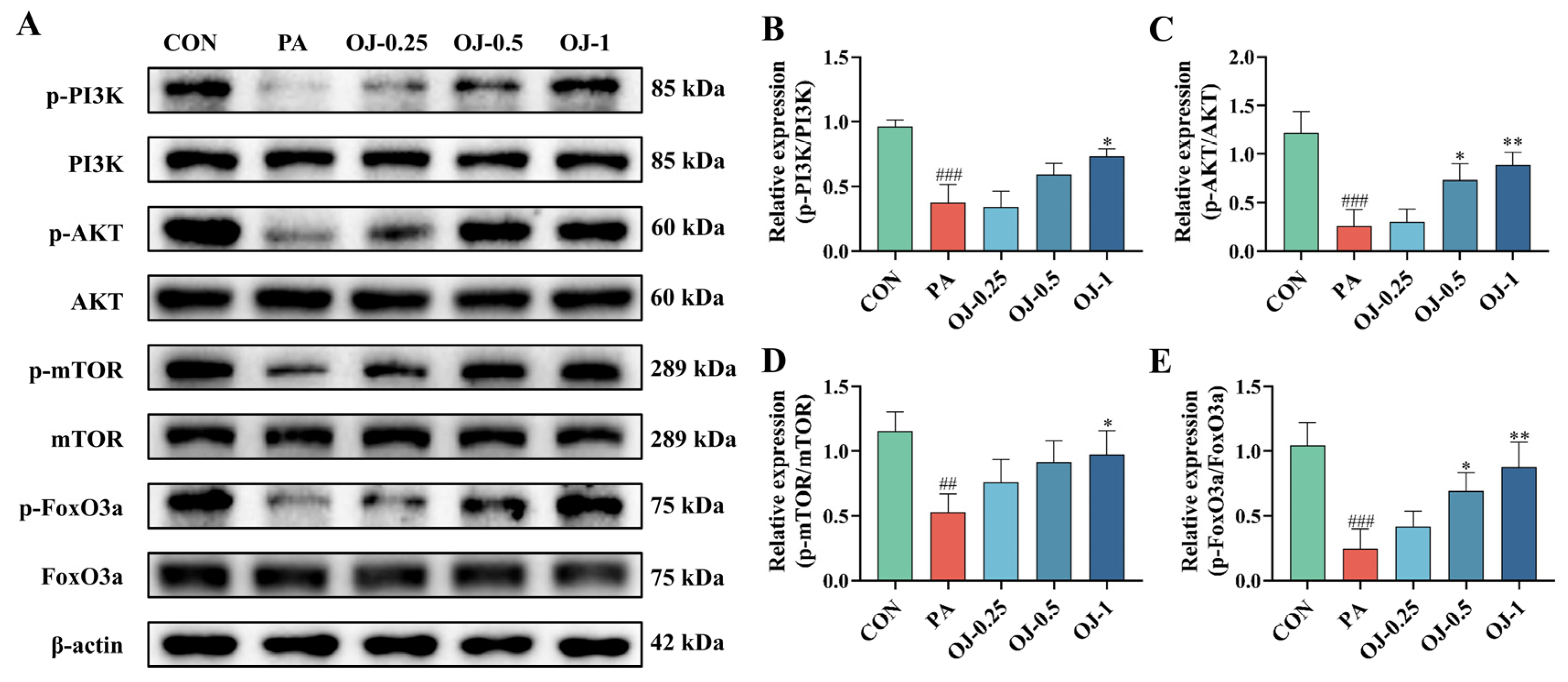 3.5. OJ Extract Regulated the PI3K-AKT-mTOR/FoxO3a Signaling in PA-Stimulated C2C12 Myotubes