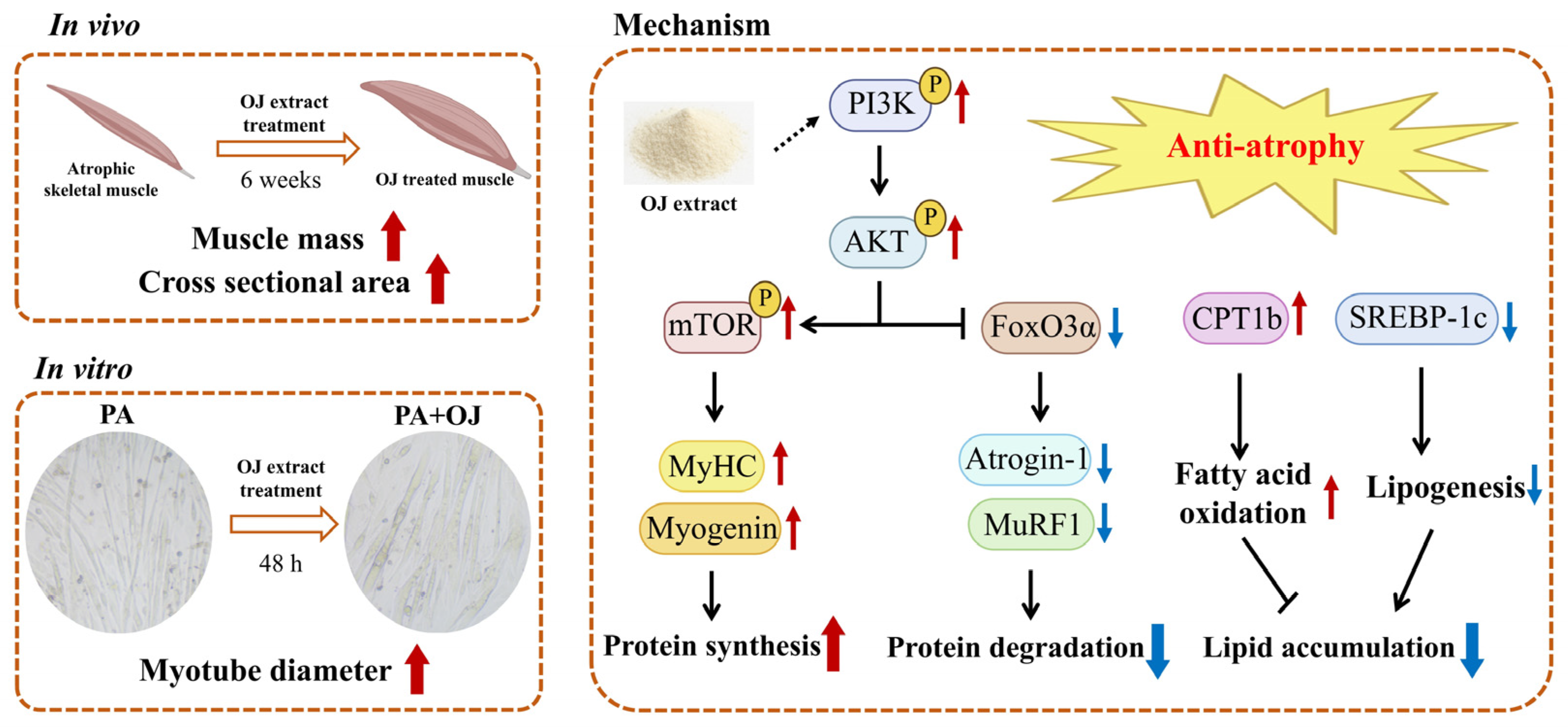 3.4. OJ Extract Alleviated PA-Induced Atrophy in C2C12 Myotubes