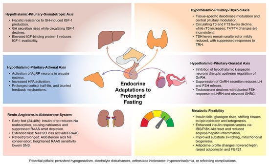 Endocrine adaptations to fasting may become clinically maladaptive when they are prolonged, amplified, or imposed on vulnerable patient phenotypes. Sustained suppression of the HPG axis can aggravate pre-existing estrogen deficiency, thereby accelerating bone loss and potentially worsening neurocognitive aging trajectories in postmenopausal women [168,169]. In men, repeated fasting-induced hypogonadism is typically reversible, but chronically depressed testosterone and gonadotropin secretion have been linked to adverse cardiometabolic profiles, endothelial dysfunction, and higher cardiovascular risk [170,171]. Persistent downregulation of thyroid hormone bioactivity characterized by reduced T3 levels and a shift toward an energetically “hypometabolic” state may lower basal metabolic rate to a degree that compromises thermogenesis, skeletal muscle mass preservation, and physical function in frail or sarcopenic individuals [172,173]. Likewise, recurrent activation of the HPA axis sustains hypercortisolemia, promoting proteolysis, visceral adiposity, immune suppression, mood disturbance, and impaired stress resilience [174]. Perturbations of the RAAS, together with fasting-associated electrolyte shifts can precipitate symptomatic hypotension, orthostasis, or hyponatremia in salt-depleted or polypharmacy-treated patients, particularly those with autonomic dysfunction or advanced chronic kidney disease, even when blood pressure otherwise improves [126,175]. Moreover, unsupervised prolonged fasting can unmask latent adrenal or thyroid insufficiency and precipitate acute metabolic decompensation. However, various high-risk conditions should also be tested in strictly supervised conditions. For example, prolonged fasting was tested in a pilot study including 20 patients with type 1 diabetes and the study demonstrated no ketoacidosis, insulin reduction (24.4 to 7.6 IU), and sustained BMI decrease at 4 months, with quality of life normalization, supporting adaptive benefits under supervision even in high risk phenotypes [176].
