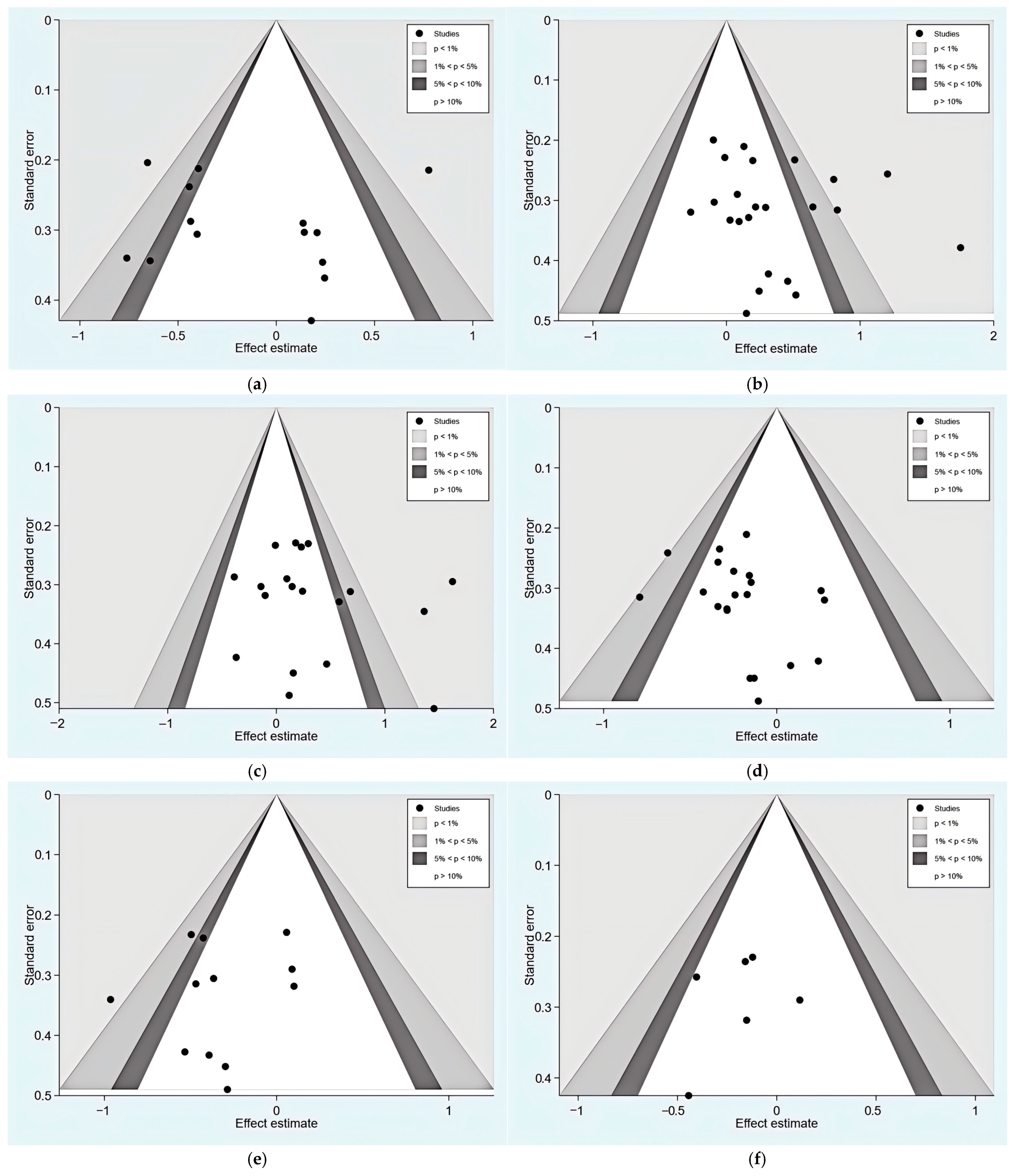 - Egger, M.; Davey Smith, G.; Schneider, M.; Minder, C. Bias in Meta-Analysis Detected by a Simple, Graphical Test. BMJ 1997, 315, 629–634. [Google Scholar] [CrossRef] [PubMed]