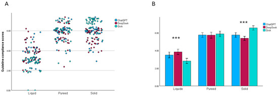 The compliance scores of the menu plans generated by the three AI models (ChatGPT, DeepSeek, and Grok) were examined in Figure 4. For all models, overall compliance scores were lowest in the liquid phase, while higher and comparable scores were observed in the puree and solid phases. Bonferroni-corrected pairwise comparison tests revealed significant differences between the models in the liquid and solid phases (p < 0.001). In the liquid phase, the Grok model had significantly lower compliance scores than DeepSeek (p < 0.001). In contrast, in the solid phase, Grok achieved the highest compliance score, outperforming DeepSeek with a statistically significant margin (p < 0.001). No significant differences were identified among the three models in the puree phase (p = 0.179).