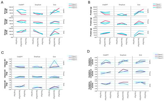 A supplemental sensitivity analysis was conducted using a smaller subset of three representative patients across three dietary phases and three models to evaluate the extent of run-to-run variability in model-generated menus (Figure 5). Energy, protein, thiamine, and guideline-compliance scores exhibited noticeable fluctuations across the first, second, and third runs within the same patient–model-phase combination. The magnitude of variation differed by nutrient and by model. For example, in the liquid phase under the Grok model, Patient 2 showed considerable run-to-run variation in energy values, with measurements of 214.32, 821.52, and 1320.87 kcal across the three runs. Regarding protein, Patient 2 in the puree phase demonstrated variability under the DeepSeek model, where protein content increased from 45.04 g to 124.58 g in the second run, followed by a decrease to 82.22 g in the third run. Thiamine content remained relatively stable across most model–phase combinations; however, a marked deviation was observed for Patient 3 in the liquid phase under the Grok model, where thiamine increased from 0.04 mg to 1.68 mg in the second run. Guideline-compliance scores also showed modest run-to-run differences.