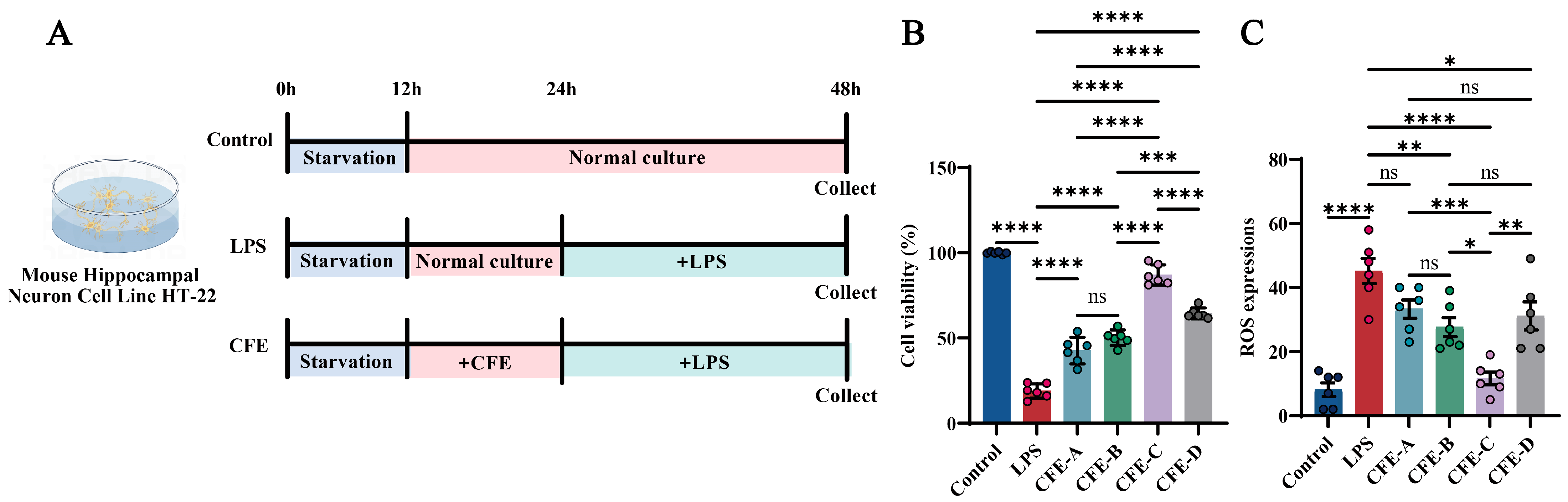 3.1. CFE Enhanced Cell Viability and Attenuates ROS Production in HT22 Cells