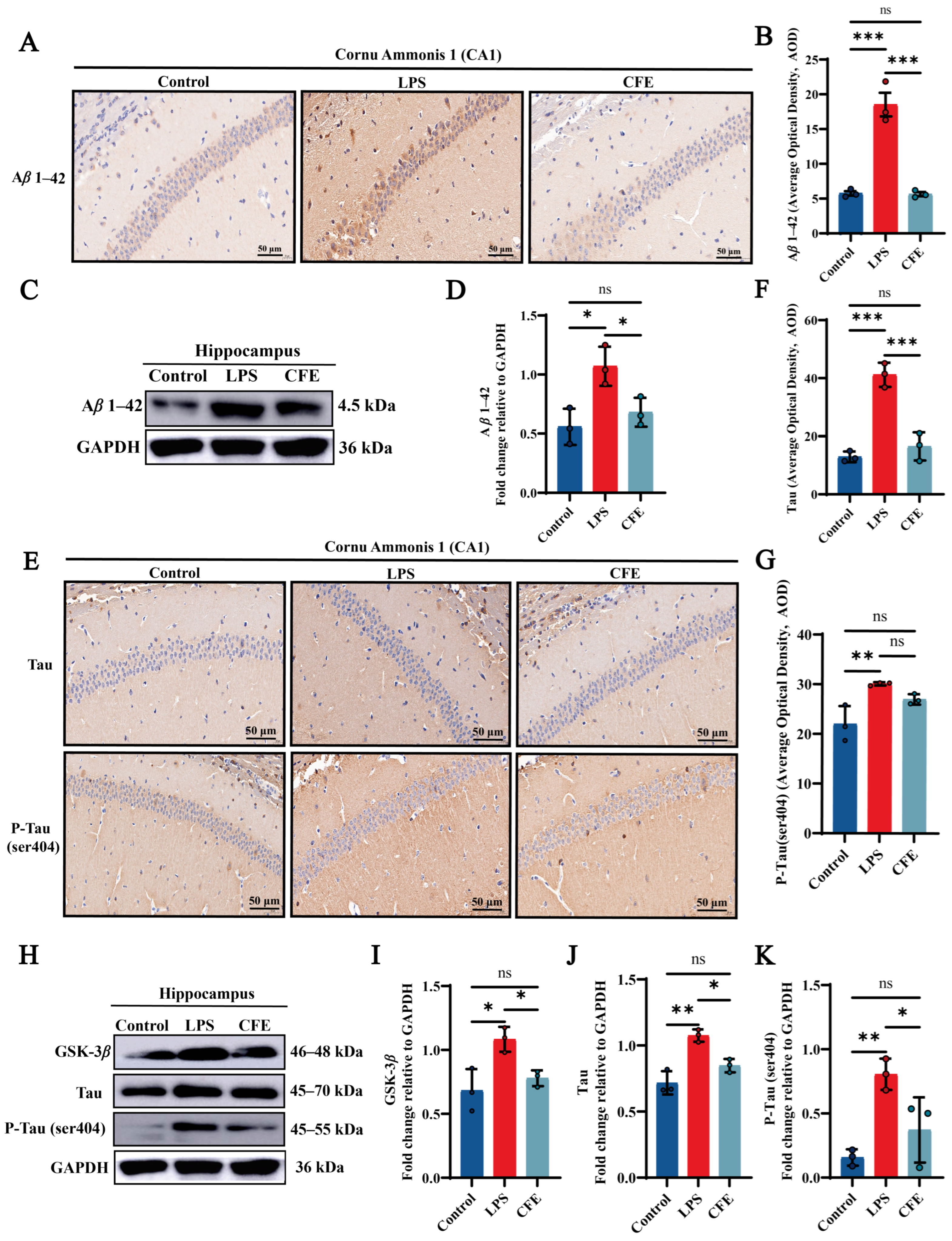 3.7. CFE Alleviated the Expressions of GSK-3β, Tau and P-Tau Protein in the Hippocampus of HNF Mice