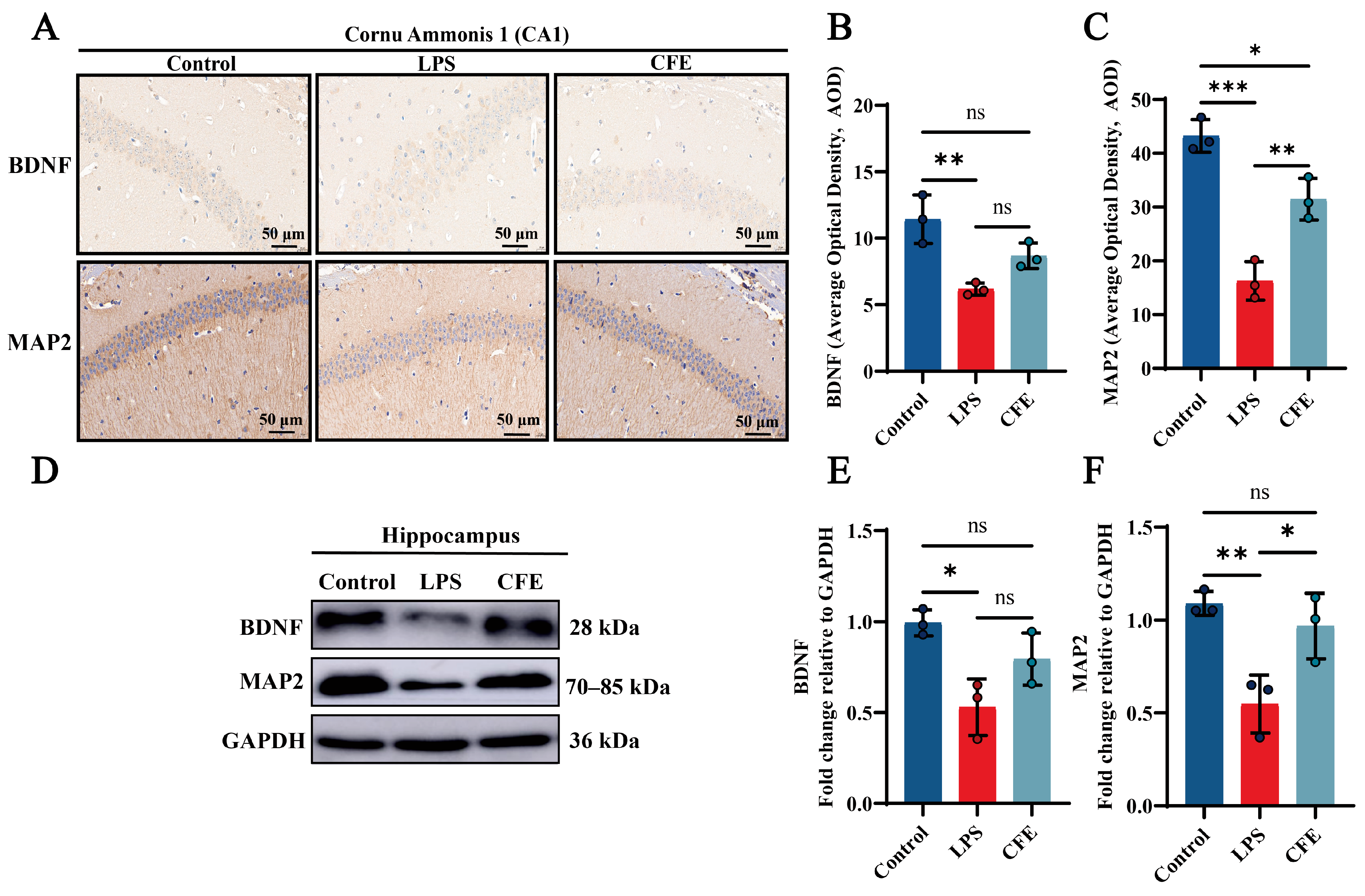 3.8. CFE Enhanced the Expressions of BDNF and MAP2 Protein in the Hippocampus of HNF Mice