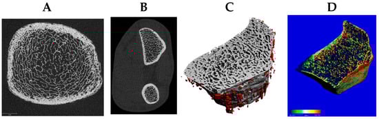 DXA assesses BMD but cannot differentiate cortical from trabecular compartments or detect microstructural deterioration, whereas newer modalities such as HR-pQCT allow detailed characterization of bone microarchitecture and strength [23]. Given S-equol’s hypothesized predominance in trabecular envelopes, outcomes that resolve compartment-specific microarchitecture are essential. HR-pQCT quantifies volumetric (v)BMD, geometry, and microarchitecture at the distal and diaphyseal tibia and radius, separately in trabecular and cortical compartments [23]. HR-pQCT images can be used to estimate whole-bone strength via micro–finite element analysis, which decomposes the 3D voxel model into elements to compute element-wise stresses, strains, and failure. The estimated failure load integrates the distribution of mineralized tissue, global geometry, compartmental densities, cortical porosity, and trabecular network topology (Figure 2).