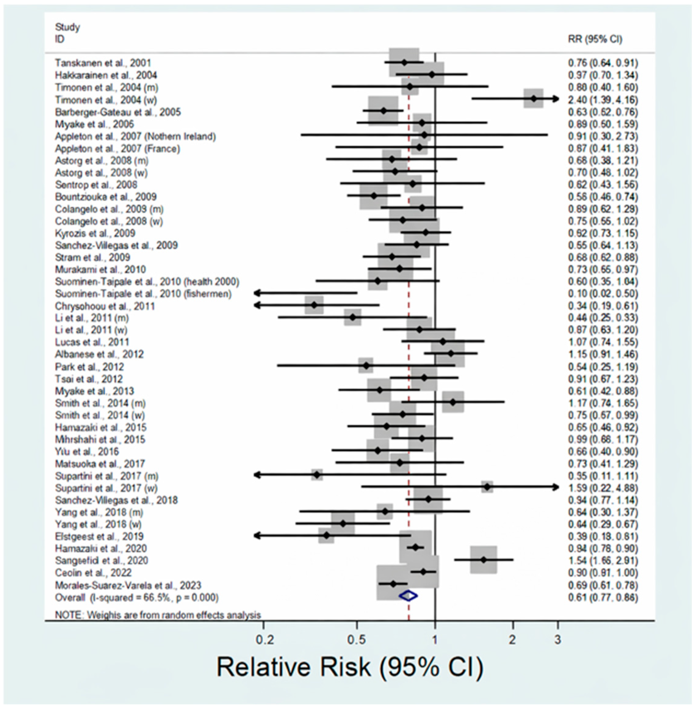 | Suominen-Taipale et al., 2010 [33]; cross-sectional | Finland | Fishermen with their families | 1265 | FFQ | CIDI-SF | Quartile4 vs. Quartile1 | 0.1 (0.02, 0.5) |