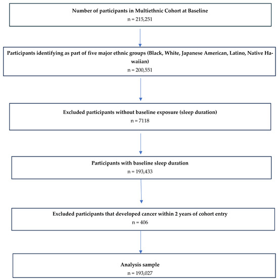 Of the 215,251 participants recruited at baseline, 200,551 were eligible for this study based on their identification as members of one of the five major racial and ethnic groups. From this group, we excluded participants who did not provide data on their baseline sleep duration (n = 7118) or who developed CRC within the first 2 years of cohort entry (n = 406). After applying our inclusion and exclusion criteria, we had an analytical sample of 193,027 participants (Figure 1).