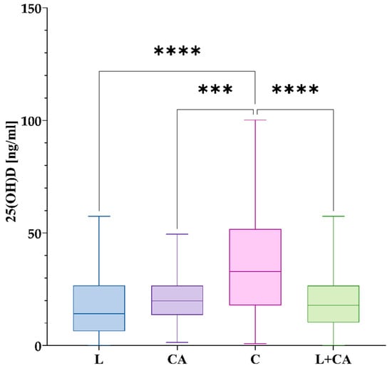 3.4.2. 25(OH)D Concentrations in Haplotypes Among the Studied Groups
