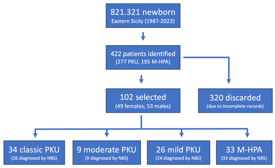 The screening center in Catania began its work experimentally in 1987, collecting samples of all the newborns from the Sicilian provinces of Catania, Ragusa, and Syracuse through a project supported by the Italian Red Cross. In January 2011, a pilot project for extended newborn screening was started; since December 2017, following the Italian law that decreed mandatory and free newborn screening for all Italian newborns, two screening centers have been officially established in Sicily: one in Catania and one in Palermo, respectively, for Eastern Sicily (provinces of Catania, Messina, Ragusa, Siracusa, and Enna) and western Sicily (Palermo, Trapani, Agrigento, and Caltanissetta) [13]. Since 1987, our center has diagnosed 130 patients with PKU and MHPA throughout Eastern Sicily. For this study, 102 patients were selected based on the availability of complete medical records and adherence to follow-up protocols, ensuring a representative and comprehensive cohort. We excluded patients without genetic confirmation of their diagnosis, those who were deceased, individuals heterozygous for PAH variants, and cases with incomplete records on dietary tolerance.