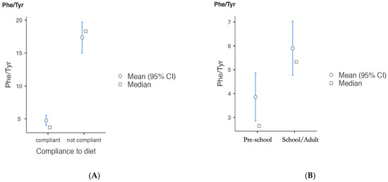 Plots on adherence to diet compared between compliant and not-compliant classic PKU patients (n = 12 compliant; n = 14 non-compliant) (A) and based on age in the compliant patients (n = 12) (B). Legend: Pre-school: <6 years of age; school/adult: 6–60 years.