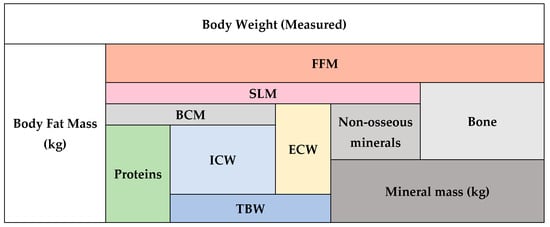 Both BCM and FFM are indicators for assessing metabolism and energy expenditure, reflecting individual differences in resting energy expenditure (REE) [66,67]. However, they are less accurate compared to indirect calorimetry for precise measurements [68,69]. The choice between BCM and FFM can influence how these metabolic variations are analyzed and interpreted. At the cellular level, FFM divides into BCM, ECF and mineral mass. BCM is recognized as the metabolically active component involved in essential cellular processes such as oxygen transport, potassium adjustment, and glucose metabolism. The ratio of BCM to FFM is variable, with research indicating that shifts in water distribution are the main factor influencing these variations [70].
