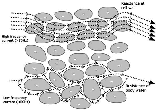 Low-frequency currents do not penetrate cell membranes and measure extracellular water impedance. High-frequency currents also penetrate wall cells and measured impedance reflects total body water (TBW).