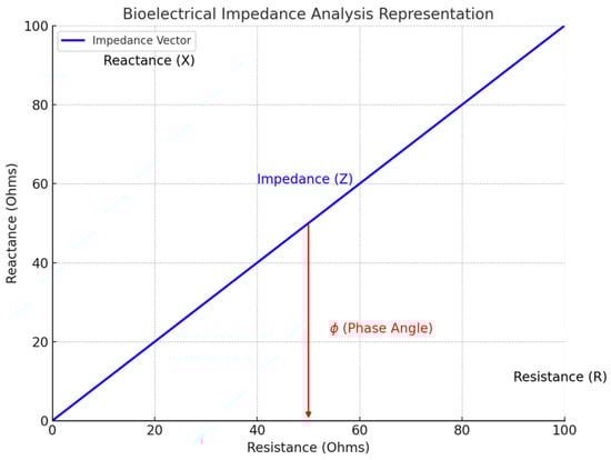 In addition, when an electric current moves across a cell membrane, latency occurs due to the membrane’s capacitive properties, causing a phase shift between resistance and reactance (Figure 3). This phase angle (PhA) represents the health of cell membranes and BCM. A PhA value above 6 degrees indicates robust, intact cells, with a larger ratio of ICW relative to ECW. Conversely, lower PhA values are associated with compromised cell membranes, indicating potential cellular dysfunction or loss of BCM [35,36,37]. Typically measured at 50 kHz for optimal signal accuracy, PhA is influenced by factors like age, sex, and fat-free mass, reflecting variations in health and body composition [38]. For instance, older adults and individuals with higher levels of body fat tend to exhibit lower PhA values due to the reduced proportion of metabolically active tissues like muscle mass.