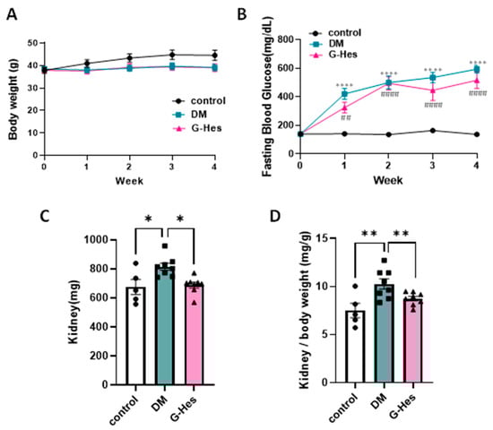 3.1. G-Hes Supplementation Suppressed an Increased Kidney Weight Without Any Change in Blood Glucose Level
