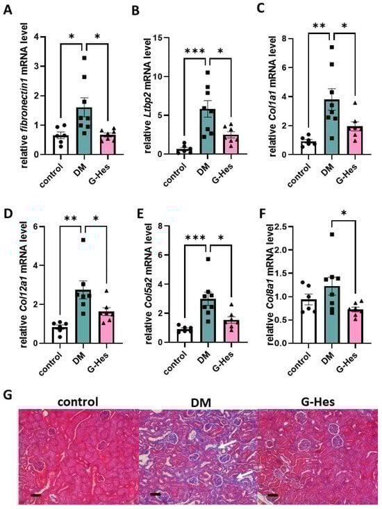 These results suggest that G-Hes supplementation suppresses mRNA expression of the tissue fibrosis-related genes upregulated by DN development. Quantitative PCR analysis revealed that G-Hes treatment downregulated the mRNA expression of Fn1, Ltbp2, and members of the collagen family (Figure 3A–F). Paraffin-embedded kidney sections were subjected to Azan–Mallory staining, which revealed that G-Hes supplementation suppressed tubular dilation, atrophy, and tubulointerstitial fibrosis, which were observed in the DM group (Figure 3G).